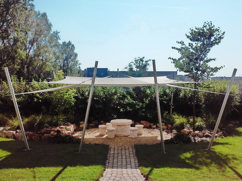 Képzelj el egy kerti sütögetőhelyet, amihez kellemes kis utacska vezet a kert legnyugodtabb, legzöldebb pontjára. A kőből épített sütögető körül gyakran összegyűlik a család, a barátok, ám ahogy a nap egyre inkább felcsavarja a hőfokot, annál többen keresik az árnyékot – illetve keresnék… Ezzel a történettel indult az a különleges projektünk, amikor a helyszínen vizsgálódva a napvitorlát ajánlottuk árnyékolóként, ráadásul mindjárt hármat. Hogy miért? Azért, hogy mindig a nap beesési szögének megfelelően állíthassák be a napvitorla szögét, amit gyerekjáték megtenni az oszlop csúszkáinak segítségével. Az sem volt kérdés, hogy itt oszlopokra építjük fel az árnyékolórendszert, hiszen nincs más rögzítési pont, szóval ezekre szereltünk fel egy négyszögletű és két háromszögű napvitorlát, amelyek a kert legmutatósabb elemévé váltak és biztonságos árnyékba borítják a sütögetőhelyet.