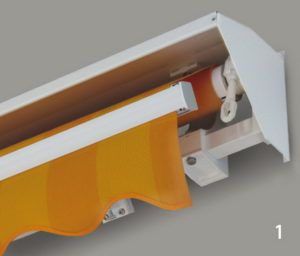 Akár 80%-kal csökkenhet egy meleg levegőjű helyiség lehűtéséhez használt energia napellenző alkalmazása révén. A Decor csuklókaros napellenző lakások, üzletek homlokzatának és családi házak, vendéglők teraszának régóta ismert árnyékolója, amelyet széles mérettartományban kínálunk a Megrendelők egyedi igényei szerint. Egy helyiség hőmérséklete optimálisan kiválasztott napellenzővel, kiváló fénytechnikai értékek mellett a legforróbb nyárban is 28 Celsius fok alatt maradhat. A napellenző dőlésszöge 0°-75° között állítható az öntött és extrudált alumínium alkatrészekből gyártott billentőszerkezettel (4), amelyben acélcsavarok biztosítják a pontos beállítást és a szilárd rögzítést. Az alumíniumöntvényekből és sajtolt profilokból gyártott közepes csuklókarok (3) a rejtett acélrugó és sodronykötél segítségével minden helyzetben feszesen tartják a ponyvát. A főtartó 40×40 mm acél zártszelvény, a ponyvahenger 78 mm átmérőjű hornyos acélcső, a homlokprofil (2) pedig 45×55 mm extrudált alumíniumprofil. A 65x225x105 mm méretű univerzális felfogókonzol (5) homlokzati és mennyezeti rögzítésre is alkalmas. A homlokzatra rögzített napellenzőre felszerelhető védőtető (1) is, amely védi a betekert ponyvát. A napellenző működtethető kézi hajtókarral, illetve 230V/50Hz csőmotorral, amely kapcsolóval, távirányítóval vagy szél- és fényérzékelővel is vezérelhető. Az árnyékoló ponyvát vízlepergető, UV-stabil, színtartó, 120 cm széles akrilszövetből varrjuk egyedi méretre. A napellenző fémszerkezete készülhet natúr kivitelben horganyzott acélprofilokkal alapáron, illetve többletköltséggel fehér vagy színes műanyagbevonattal.